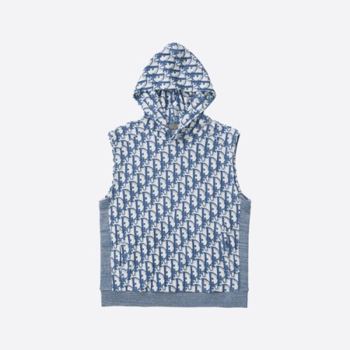 디올 오블리크 노슬리브 후드 스웨트셔츠 블루 & 화이트 테리 코튼 저지 > ★ Top