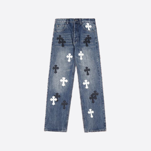 크롬 하츠 블루, 블랙, 화이트 가죽 트리밍 스트레이트 팬츠 > ★ Pants