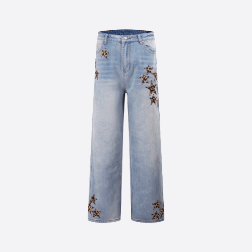 크롬하츠 블루 스타 프린트 레오파드 가죽 데님 작업 바지 > ★ Pants