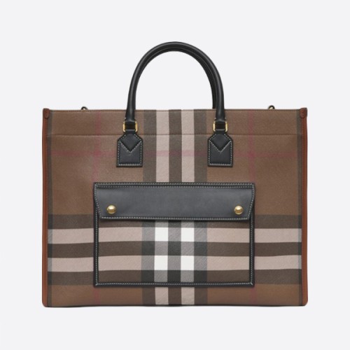 버버리 미디엄 체크 가죽 플레어 토트 칼라:다크 자작나무 브라운 80523311 > ★ Bags