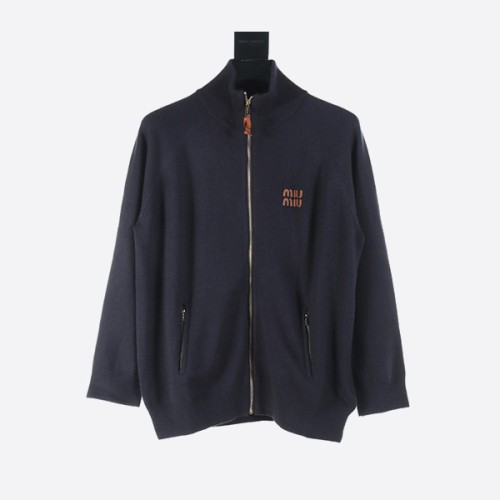 미우미우 24FW 스탠드업 컬러 지퍼 레더 라벨 레터 니트 가디건 자켓 > ★ Outer