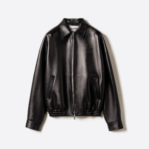 스탠드업 칼라와 자수 로고가 있는 Miu Miu 가죽 재킷 > ★ Outer