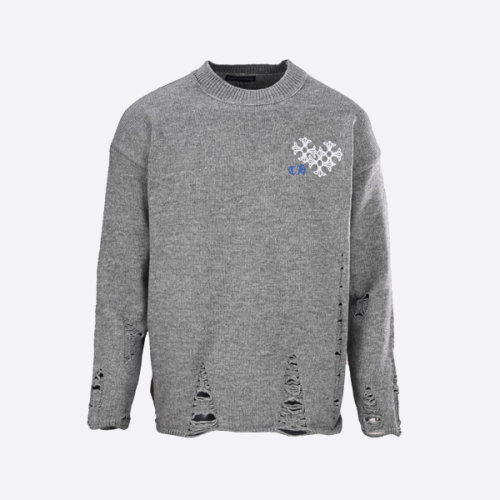 크롬하츠 자수 디스크 산스크리트 십자가 찢어진 니트 스웨터 그레이 > ★ Top