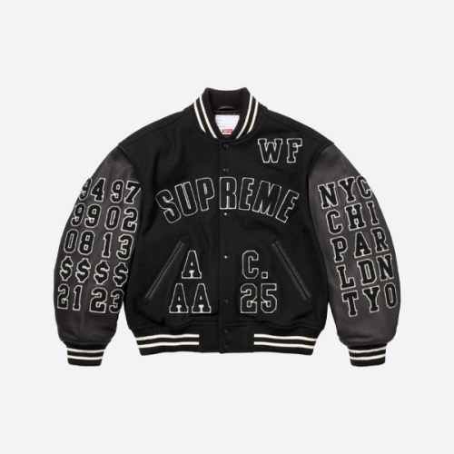 슈프림 셰닐 아플리케 고등학교 주장 소매 야구 재킷, 블랙 > ★ Outer